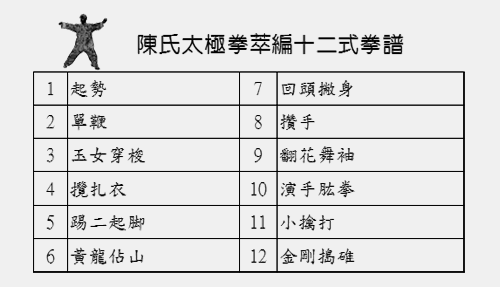陳氏太極拳萃編十二式套路,特將陳氏太極拳較為特有之動作,萃編於十二式之中,除所有拳式開合轉換過程所具之柔勁外,另含蹦躥、跳躍、發勁與震腳等剛勁動作,此套萃編若能嫻熟,於陳氏太極拳之理法可謂大致已備。